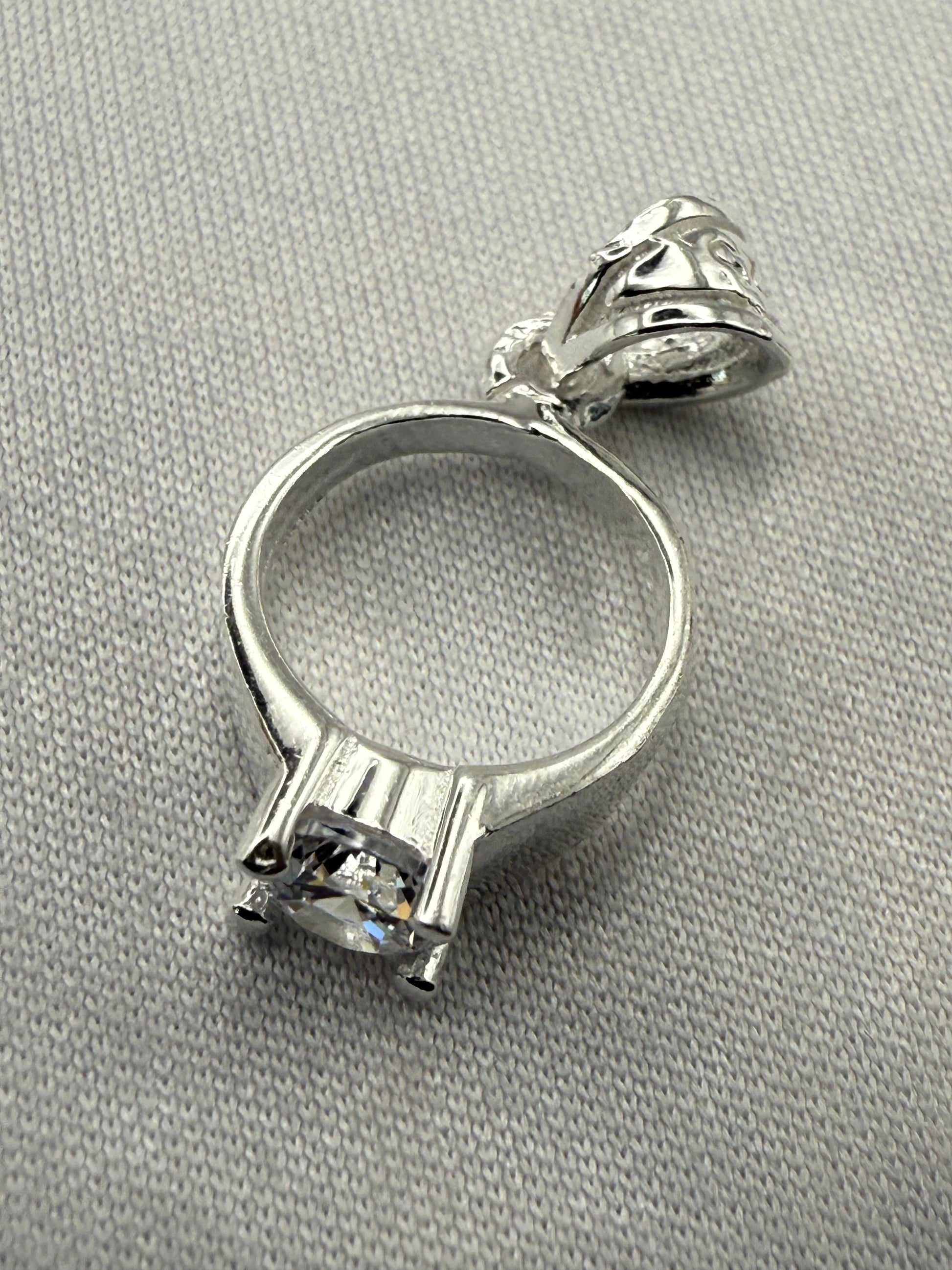 This versatile Cubic Zirconia Ring Pendant offers a brilliant, classic look designed to hang beautifully from a chain. It is made from high-quality Sterling Silver 925, providing a durable and shining frame for the design. The piece features a central C/Z stone, or a band of small C/Z stones, replicating the look of a fine diamond ring, making it a simple yet elegant accessory for daily wear.
