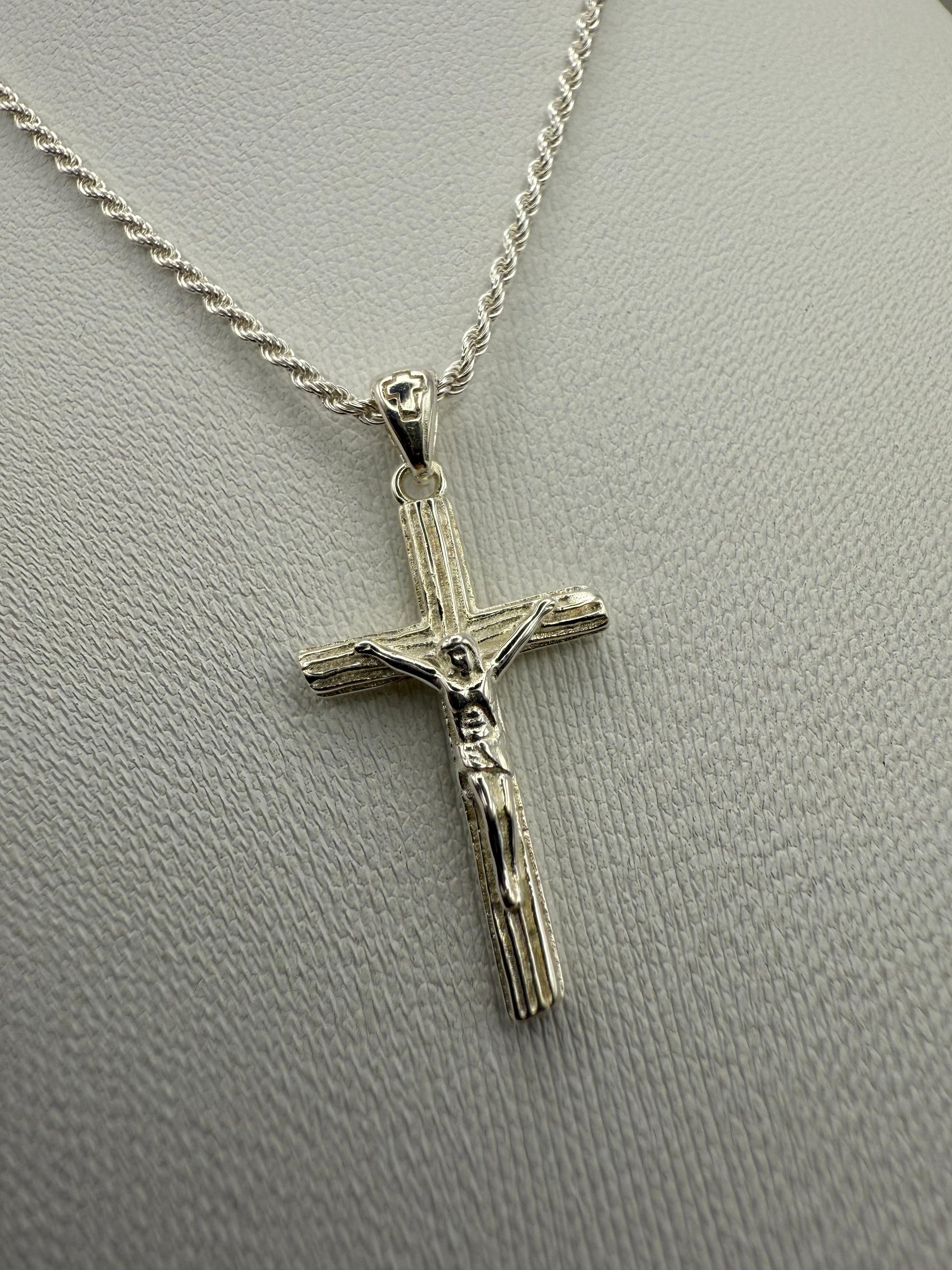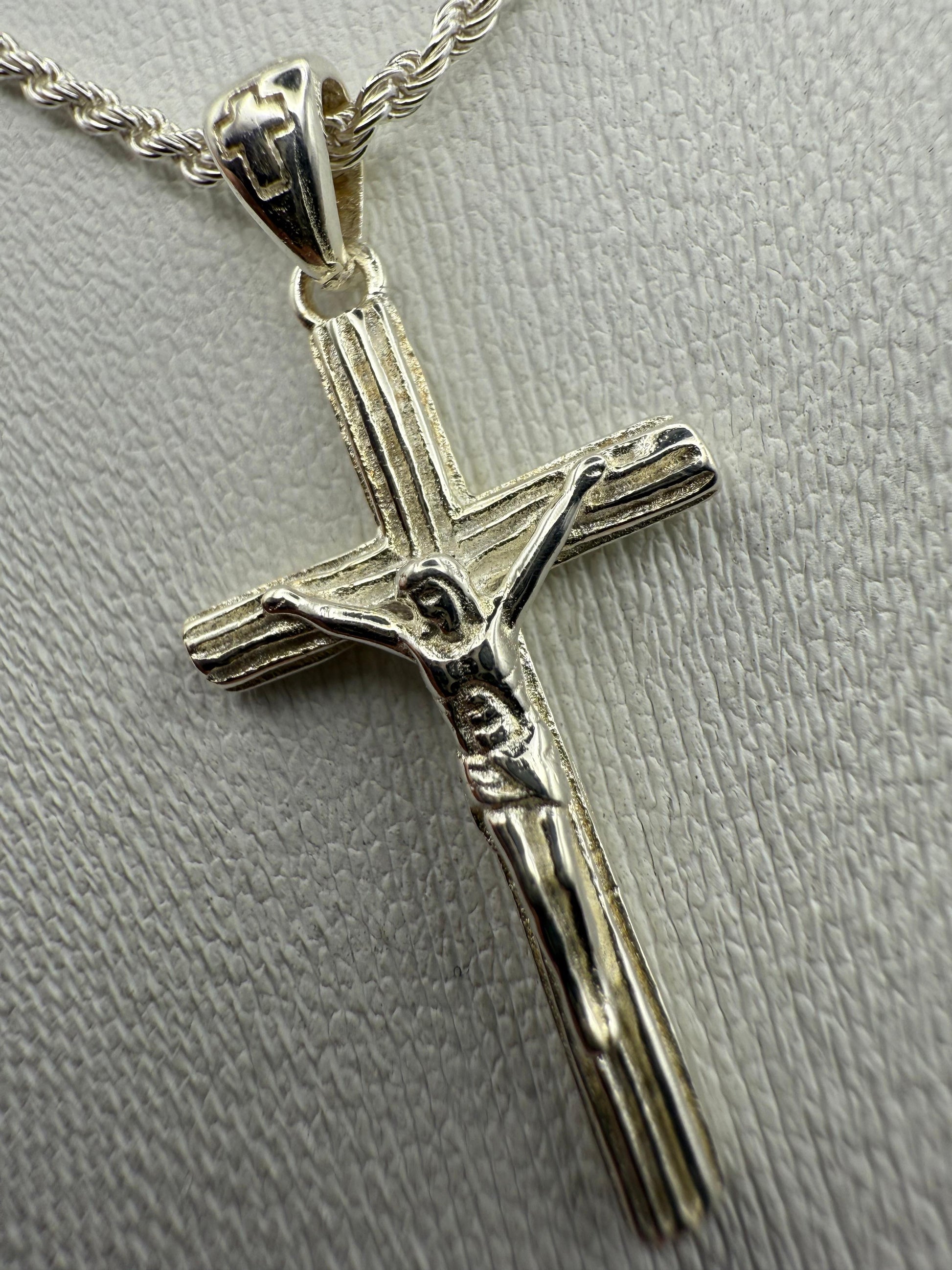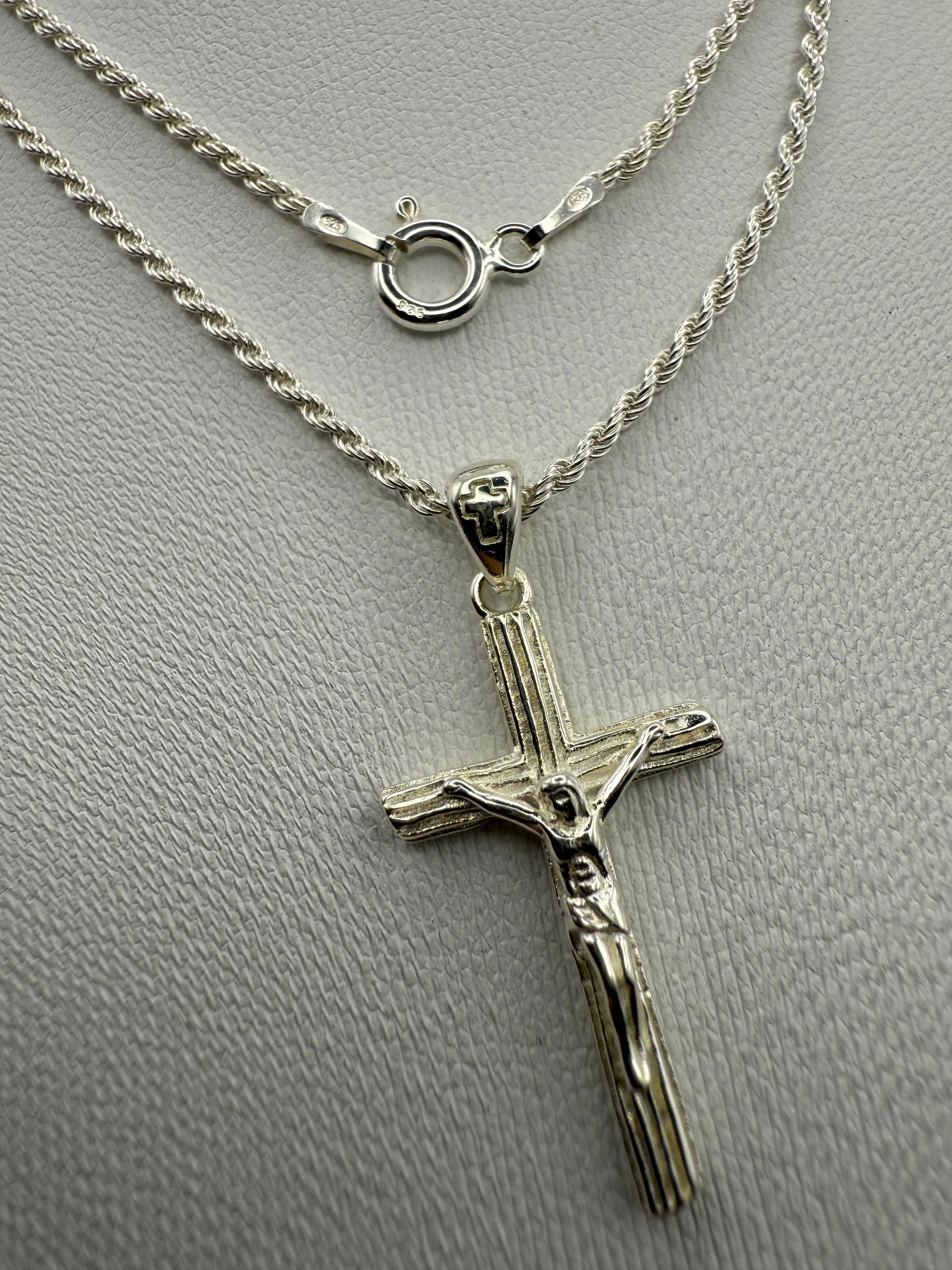 This traditional Crucifix Necklace is a powerful symbol of faith, crafted for lasting quality and presence. The piece features a detailed Crucifix pendant paired with a matching chain, all made from genuine, high-quality Sterling Silver 925. The fine detail and sterling material ensure a refined, polished finish, making this jewellery a cherished and durable staple.