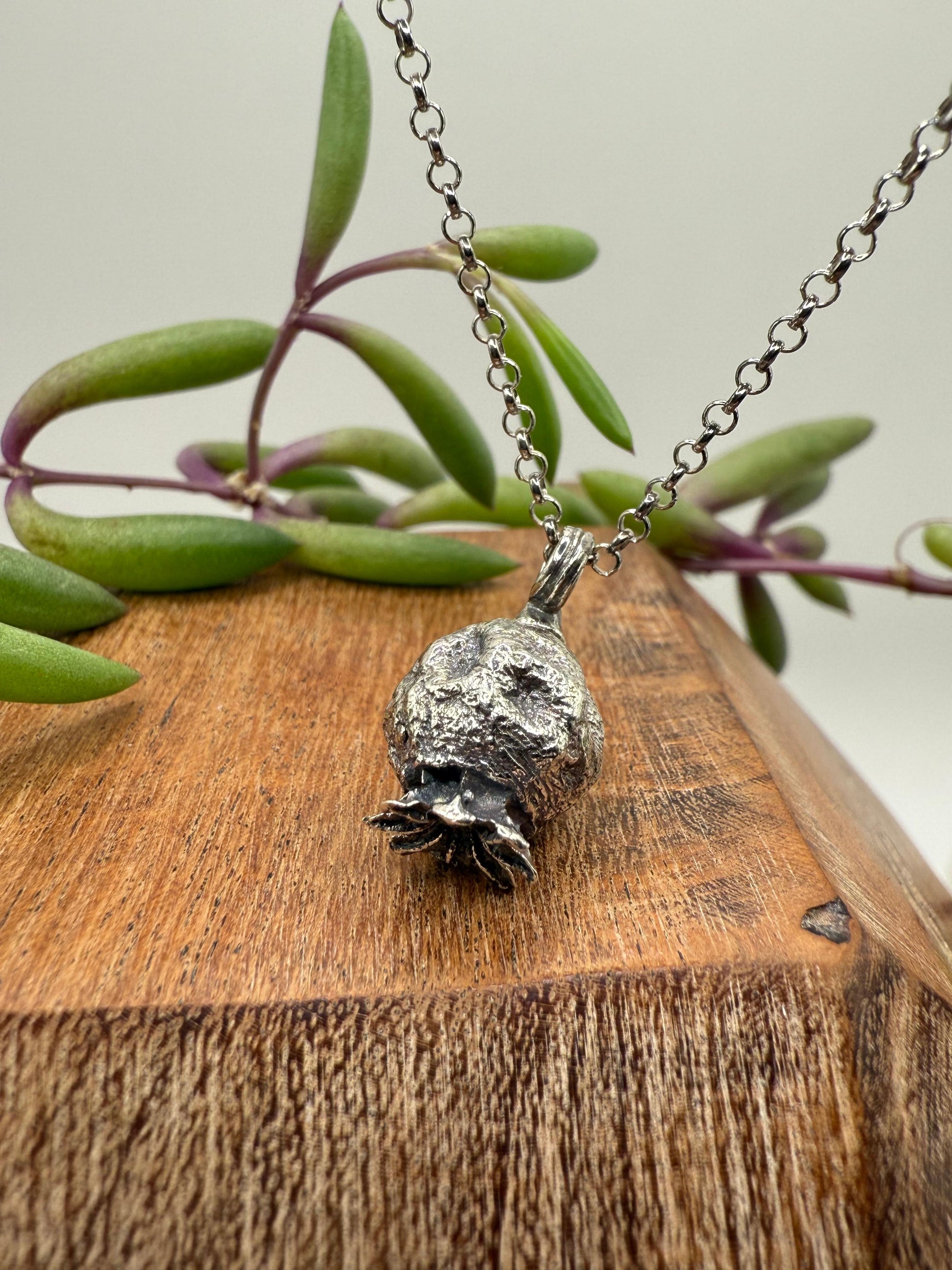 The Poppy Jewellery Collection is inspired by the enduring symbol of the poppy flower, a delicate yet resilient bloom that stands for remembrance, sacrifice, and hope. Using the ancient lost wax casting technique, I transform actual poppy seed pods into intricate sterling silver jewellery, celebrating their natural beauty and poignant symbolism. This collection features both whole small seed pods and halved larger pods, each uniquely crafted.